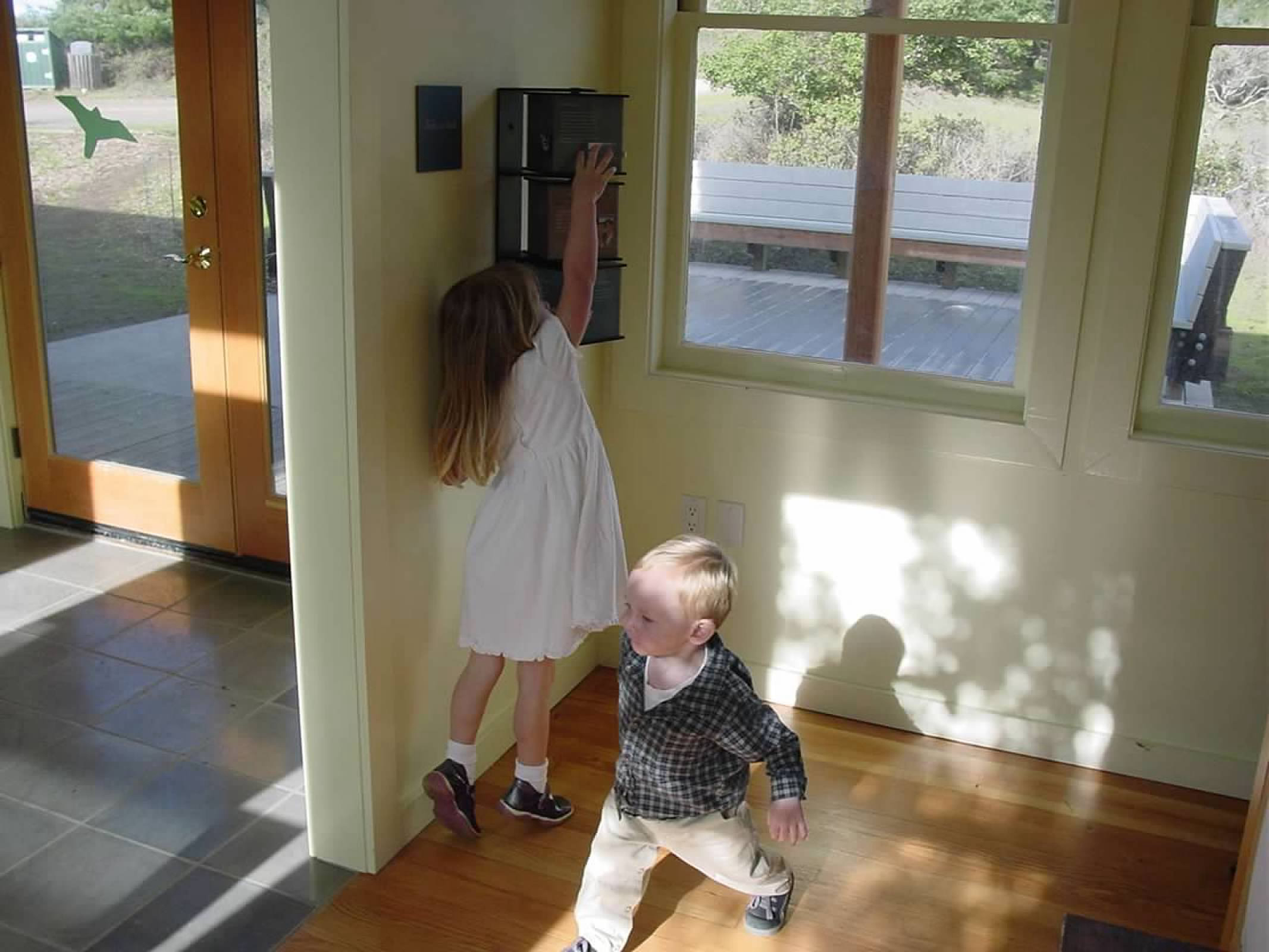 Custom-built wall-mounted interactive elements that encourage tactile learning and discovery